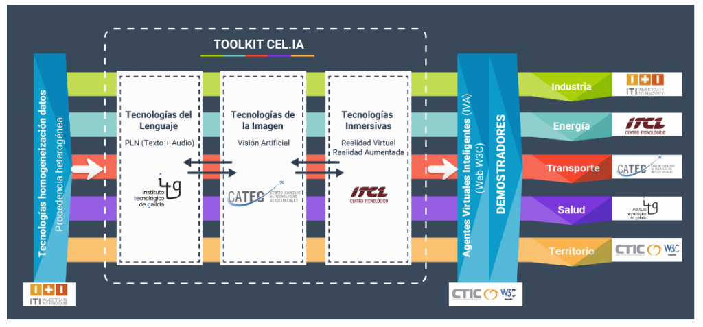 1) RED DE COLABORACIÓN CEL.IA – Desarrollo del mencionado Toolkit de soluciones tecnológicas de realidad virtual y aumentada, visión artificial y procesamiento del lenguaje natural, generado a partir de una hoja de ruta tecnológica común construida a partir de las capacidades y competencias individuales de cada uno de los 5 Centros Tecnológicos.