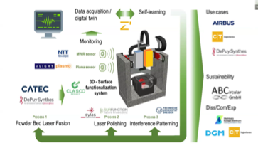 Si bien las piezas complejas se producirán mediante fusión de lecho de polvo láser, el pulido láser y la microestructuración superficial láser mediante patrones de interferencia láser directa se combinarán en un sistema de fabricación único. Esta ruta sustituirá varios procesos que consumen muchos recursos, reduciendo el impacto ambiental. La implementación permitirá sustituir métodos estándar perjudiciales para el medio ambiente e incluso obtener un mejor rendimiento. Además, se implementarán diferentes métodos de monitorización en línea, en concreto sensores de plasma y cámaras infrarrojas. De esta forma, será posible obtener una representación virtual del proceso para cada pieza (gemelo digital), creando un producto completamente digitalizado. Se analizarán los impactos del proyecto para optimizar la sostenibilidad de los procesos y productos a lo largo de todo su ciclo de vida.